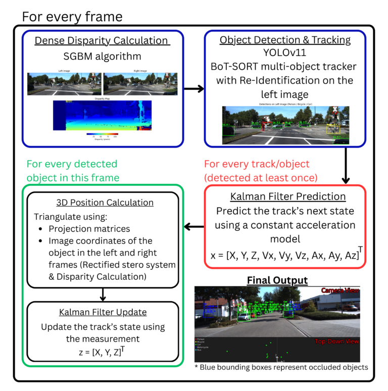 Stereo Vision & 3D Triangulation – Using rectified stereo image pairs, dense SGBM disparity, and known camera projection matrices, the system computes accurate 3D coordinates for each detected object. A constant-acceleration Kalman filter smooths trajectories and predicts object motion during short occlusions.